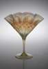 of flattened tapering form with a frilled rim, raised above slender stem and spreading base, the body decorated with opalescent flowerheads, and covered with a irridescent wash