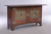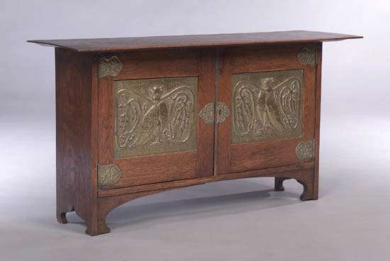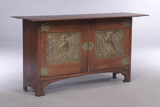 with repoussé decorated brass panels in the manner of Alexander Ritchie, Iona, the overhanging top above twin doors with decorative entwined foliate hinges and escutcheon, the panels depicting fantastical birds holding brambles in their beaks