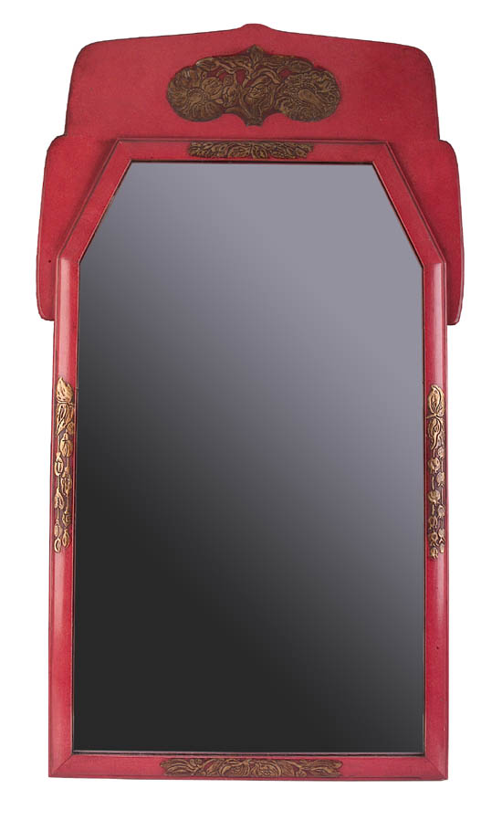 by Whytock and Reid, Edinburgh, the shaped rectangular red lacquer frame with cresting moulded with stylised plant forms overpainted in gilt