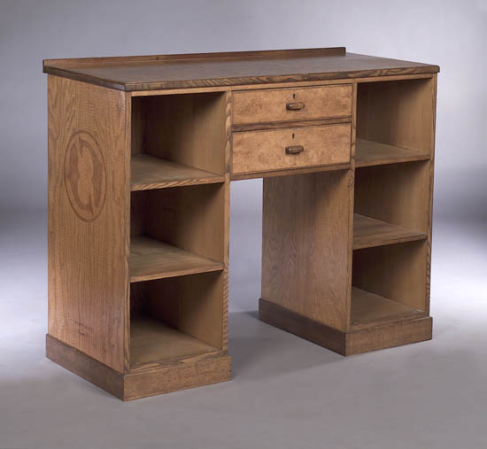 by Whytock and Reid, Edinburgh, the rectangular top over two drawers and an arrangement of open shelves, the sides inlaid with marquetry roundels depicting entwined fish