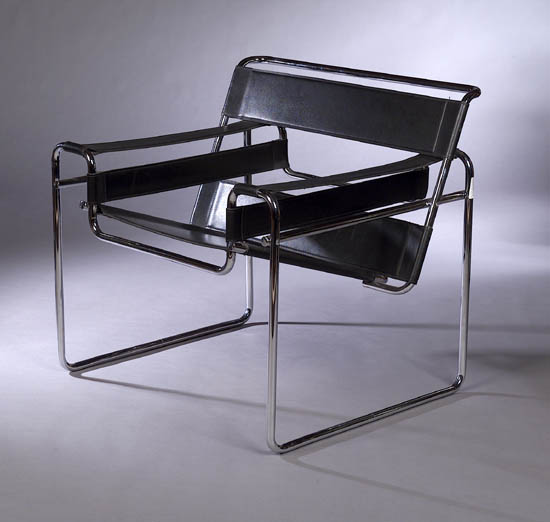 designed by Marcel Breuer circa 1925, each with tubular frames and black leather strap upholstery (2)