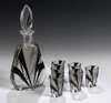 comprising a decanter and stopper and six glasses, each cut with an angular design, etched and incised with stylised plant forms and incised with stylised plant forms and enhanced with black enamel