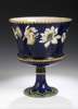 the tapered body painted with waterlilies on a blue ground, the whole raised on a tapered stem support, impressed mark, printed Thomas Goode mark