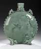 with twin handles, moulded with peony brambles and flying birds in the Japanese style and raised on scrolled feet, the whole covered in celadon glaze, impressed marks 542