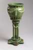 of ovoid form the jardiniere moulded with roses and leafy swags, raised on a stand with three cylindrical columns moulded with roses and leaf swags on a spreading base, the whole glazed in green, moulded and incised marks