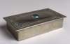 the hinged rectangular lid repousse decorated with a band of entwined tendrils and centred by a turquoise enamel roundel, above plain sides, stamped monogram mark