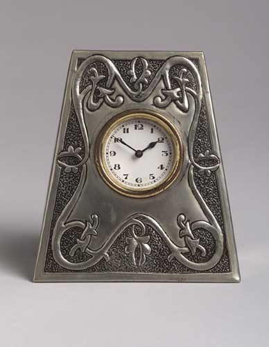 the circular dial enclosed within rectangular frame, repousse decorated with an entwined foliate decoration on a hammered ground