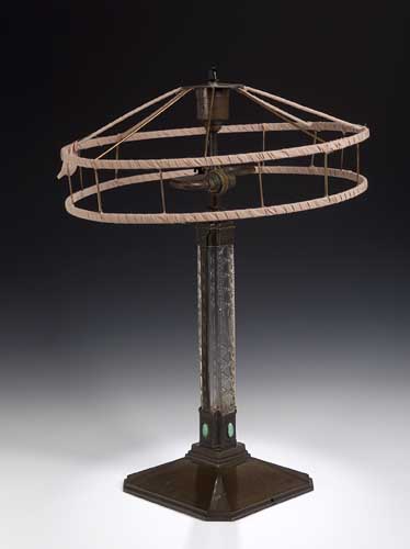 the tapered cylindrical shade (silk lacking) above double light socket and moulded cut glass column, with bronze cappings cut with oval jadeite cabochons, the whole raised on spreading canted square base