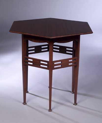 the moulded top raised above square tapering legs linked by pierced stretchers and terminating in pad feet