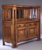 the three quarter cushion moulded cornice supported by square tapered columns, the panelled back inlaid with stylised plant form and with central bevelled mirror enclosed by sides carved and pierced with stylised tulips, the base with two drawers above two inlaid panel doors