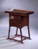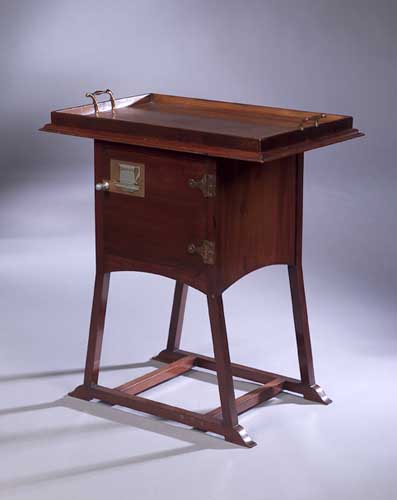 the removable rectangular tray with gallery and brass carrying handles, above a moulded rim, above single drawer with copper hinges and pewter and copper inlaid panel depicting a teacup and saucer, with similar panel to the rear, the whole raised on square supports linked by stretchers