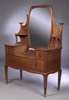 the shaped and bevelled mirror mounted in a carved and broad waisted swirled frame flanked by complimentary curved arms each with open shelf and pierced supports terminating in small circular plinths onto two stepped drawers and one long drawer all with original hinged copper handles on carved legs terminating in castors