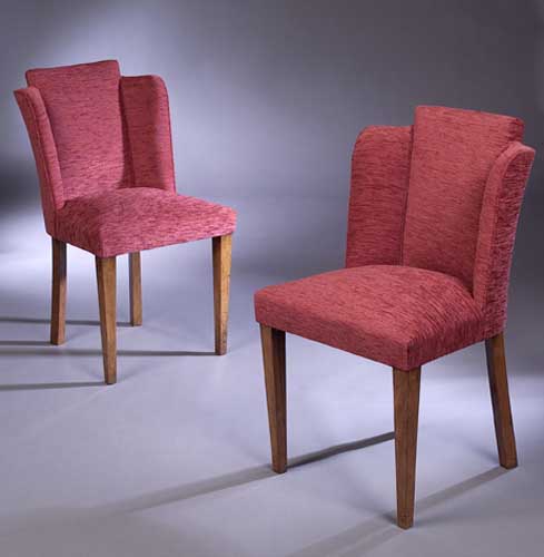 each with upholstered 'cloud' backs in deep pink plush, the upholstered seats and square tapered legs (6)