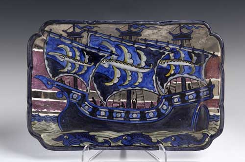 of shaped rectangular form painted in pink and silver lustres and in shades of blue and green with a galleon in full sale and painted verso with an exotic fish with a monogram mark