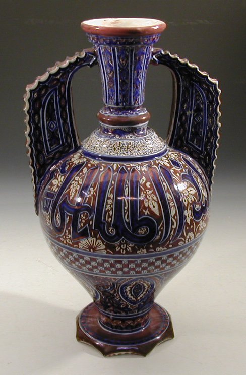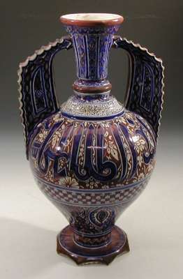 in the Moorish style, the baluster body with serrated handles and lobed base painted in blue and rose lustre on a white ground, painted marks