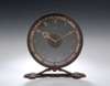 the circular double sided green glass dial of circular outline enclosing pierced filigree border, the central movement with pierced hands, the whole raised on shaped base with stepped and pierced trefoil terminals