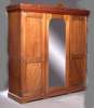 the castellated moulded cornice above central mirrored doors flanked by two doors with tongue and groove panels enclosing a fitted interior and with decorative brass hinges raised on a plinth