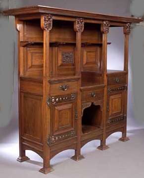 the moulded and projecting cornice above a panelled back with open shelf and central panel carved with a stylised seedhead, the stepped rectangular top with four column supports having fruit and leaf carved capitals above two drawer and two panel doors enclosing a further door and open shelf, the doors with elaborate copper hinges, the drawer with corresponding handles, all raised on square legs with spreading square feet, bears makers label