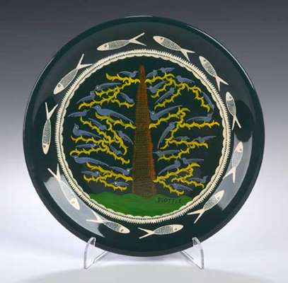 entitled 'Bird Tree and Fish' and painted in colours on a deep turquoise ground, signed 'Scottie'