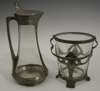 the tapering clear glass bucket with pierced frame, moulded with stylised plant forms, stamped mark 2223, 18cm high, also an Art Nouveau pewter flagon, the tapering clear glass vessel enclosed within frame with hinged lid, cast with stylised plant forms, unmarked, 31cm high (2)