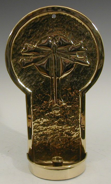 in the manner of Margaret Gilmour, repousse decorated with a dragonfly on a beaten ground with candle nozzle and drip tray below