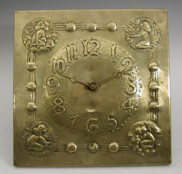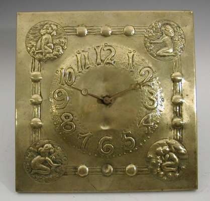 the square dial repousse decorated with a chapter ring enclosed by four roudels depicting fairy nymphs, includes pendulum and weights