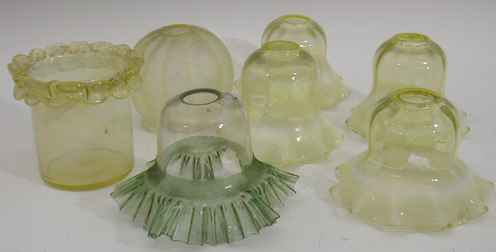 each of bell form with frilled rims, the pale green glass with opalescence to the rim, 13.5cm diameter, also two further Vaseline glass shades and a green glass shade with frilled rim (7)