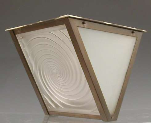 each of 'V' shape with spirally moulded and frosted glass panels in a bronze frame (2)