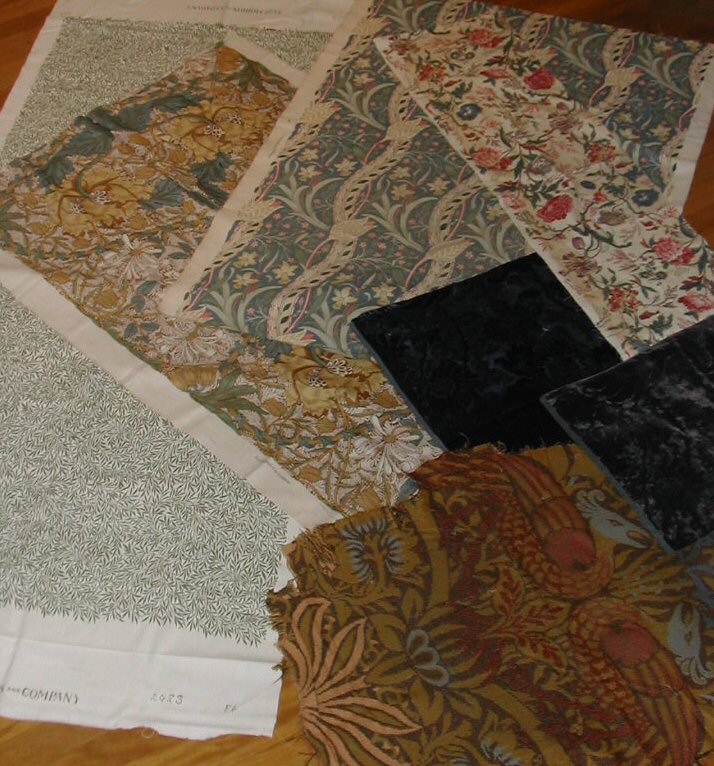 to include 'Willow' a length of printed cotton fabric, selvedge marks,177cm x 90cm, 'Honeysuckle' a length of printed linen fabric, selvedge marks, 145cm x 90cm, 'Daffodil' a length of printed linen fabric, selvedge marks, 123cm x 90cm,'Utrecht Velvet' two lengths of embossed mohair plus, 58cm x 43cm and 68cm x 58cm, 'Peacock and Dragon' a seat cover of woven wool fabric, 85cm x 55cm approx, 'Tangley' a length of cotton chintz fabric, 130cm x 35cm and a roll of wallpaper (8)
