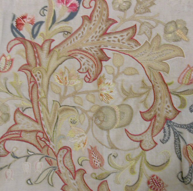 Note: Sir William Beale became Liberal M.P. for Galloway. His younger brother James Beale commissioned Philip Webb to build Standen and he in turn engaged Morris & Co. to furnish and design the interiors with textiles, wallpapers and furnishings. William Morris became a personal friend of the Beale family and consequently his influence can be felt at all their residences; 32 Holland Park, London; 'Bryntirion', nr Dongelan, Wales, 'Drumlamford', South Ayrshire and of course 'Standen', East Grinstead, Surrey. Margaret Beale, James' wife, and her daughters were talented needlewomen who were inspired by Morris to work elaborate embroidery hangings after his designs (one of a pair of hangings in Morris' 'Artichoke' design now hangs in the Victoria and Albert Museum) and many of these are still at Standen. She helped found the Royal School of Needlework in 1872 and passed on many of her skills to other members of her family including Lady Phipson Beale who worked the lot offered here.
