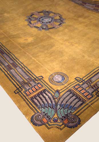 machine woven, the golden yellow field with central medallion and polychrome faun motifs to the angles