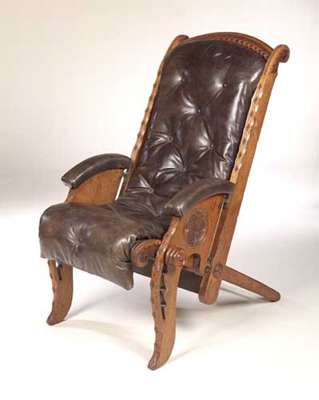 in the style of Charles Bevan, the arched top rail with carved band above carved uprights with entrelac scrolled terminals, the leather upholstered and buttoned swing seat enclosed by curved armrests and shaped adjustable front legs carved with trefoil roundels, the sloping rear legs linked by stretchers