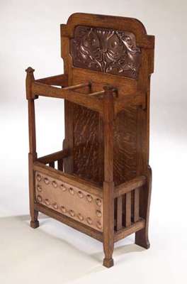 A Wylie and Lochhead oak and copper inset stick stand,