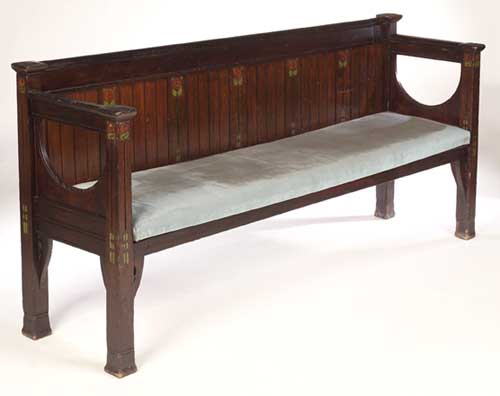 A Scottish Arts and Crafts stained pine and pokerwork decorated hall settle,