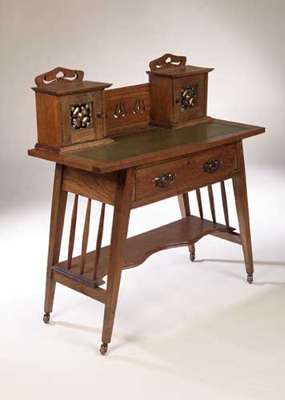 the superstructure with twin cupboards having pierced brass grilles enclosed by a pierced ledge back, the bowed top inset with leather writing surface above a single drawer on square tapered legs linked by an undertier