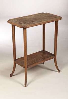 the rectangular top with inset angles, marquetry inlaid with flowers, above turned and moulded legs linked by a further inlaid tier and terminating in splayed legs, inlaid signature