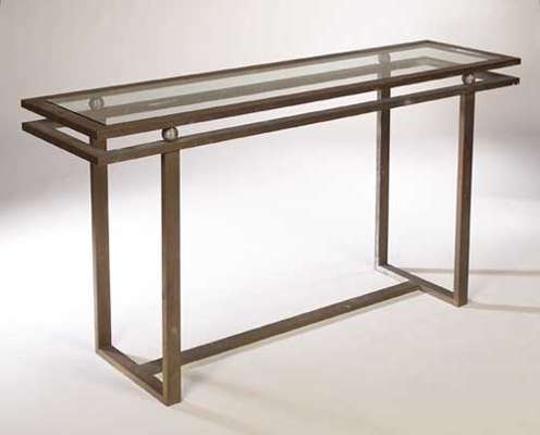 the rectangular top with inset clear glass panel above ribbed ball spacers and U-shaped supports linked by a stretcher