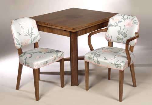 comprising a draw-leaf dining table, the rectangular extending top above concave supports linked by cross stretchers, 151cm long (extended), a sideboard, the rectangular top above two drawers with two doors below enclosed by concave angles, 137cm across, an assistant sideboard, 107cm wide, and eight dining chairs to match, including two carvers (11)