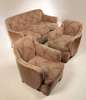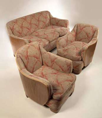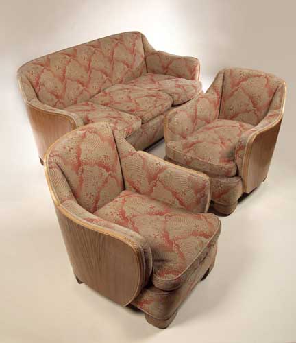 comprising a three seat sofa and two matching armchairs, each upholstered in red and buff uncut moquette fabric, the backs and arms in walnut veneer, the arm uprights embellished with fishscale carving, the whole raised on stepped block feet (3)