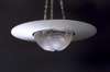 each with dished circular shades, moulded with shells, the rims with chromium fixings and attached broad circular frosted rim, original chromium hanging chains, wheel etched marks 'R. Lalique, France' no 3201 (2)