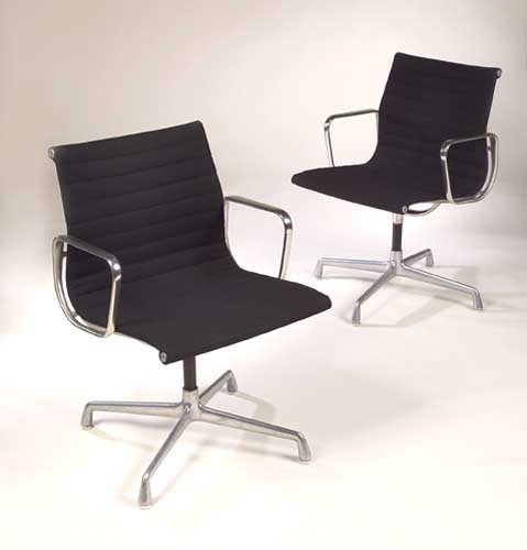 manufactured by Herman Miller, each with ribbed upholstered back and seats with black Hessian supported in an aluminium frame with swivel base and four curved legs, cast makers marks (6)