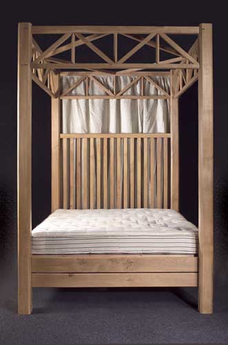 An oak four poster bed, designed by William Petrie,