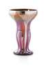 of tapering trumpet form with inverted rim, in translucent rose coloured glass decorated with iridescent purple, blue and green stretched oil spot motifs against a gold ground, overlaid with sinuous foliate motifs, painted marks to base 3/781/H789