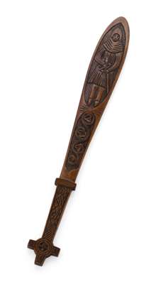 of elliptical form, carved in bas relief with the figure of a warrior, with cruciform handle