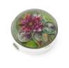 of circular form, the cover depicting a waterlily flower and four lily pads in shades of pink, yellow and green on a green painted ground, nickel thumb piece, interior cover inset with a mirror, the underside of base with a painted area, hallmarked London 1952