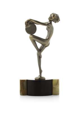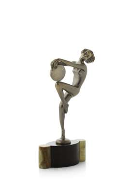 cast as a naked girl, holding aloft a disc, raised on an ovoid black slate and green onyx plinth, signed in the bronze LORENZL