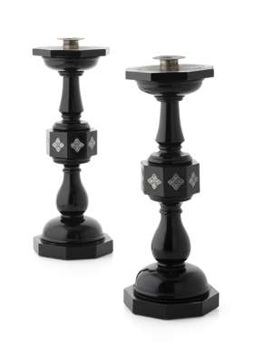 EBONISED AND INLAID TABLE CANDLESTICKS, CIRCA 1900