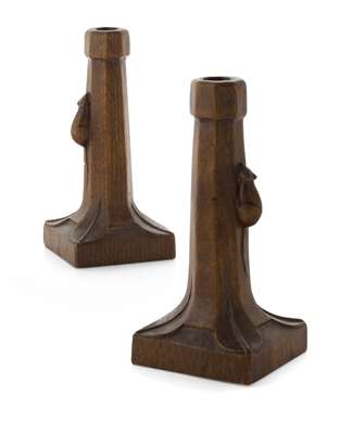 each of facetted tapering form with square leaf-carved bases, carved mouse signature, 20cm high; also an OAK CHEESE BOARD, of oval outline, with carved mouse signature to the handle, 37cm long (3)