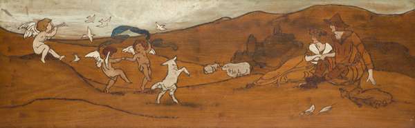 painted with coloured enamels, one depicting a fisherman with mermaids; the other a shepherd with putti (2)