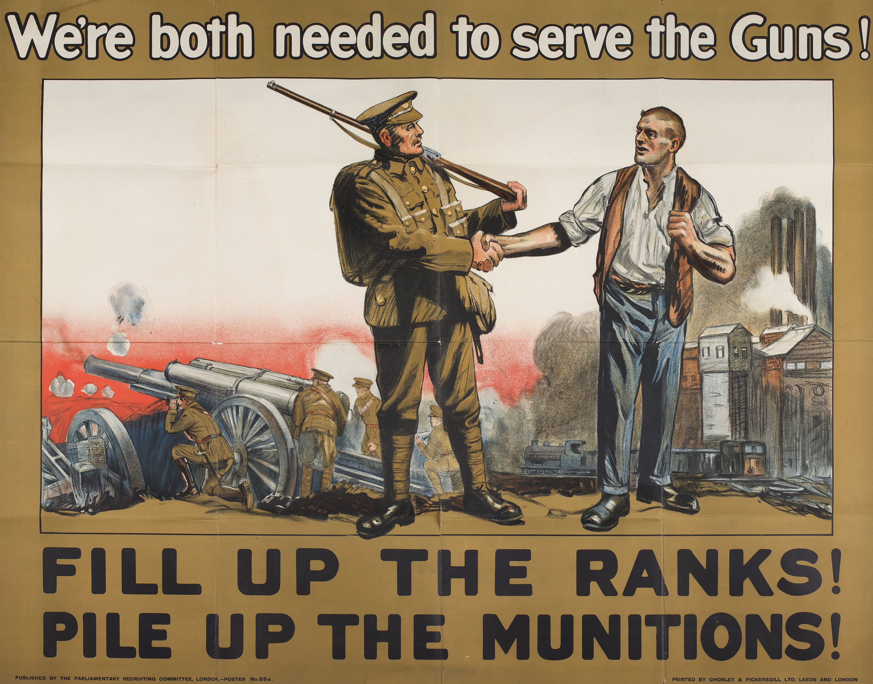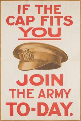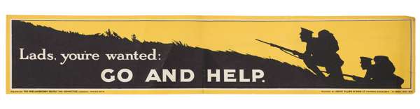 including AN APPEAL TO YOU, by Roberts & Leete Ltd., 98cm x 63.5cm; FILL UP THE RANKS!/ PILE UP THE MUNITIONS!', by Chorley & Pickersgill Ltd, 99cm x 126cm; WAR LOAN, 76.5cm x 50cm; REMEMBER BELGIUM/ ENLIST TODAY, 100.5cm x 74.3cm; IF THE CAP FITS/ JOIN THE ARMY TODAY, 74.6cm x 51cm; LADS YOU'RE WANTED/ GO AND HELP, 15cm x 76cm; WHAT WILL YOUR ANSWER BE / ENLIST NOW; etc (qty)